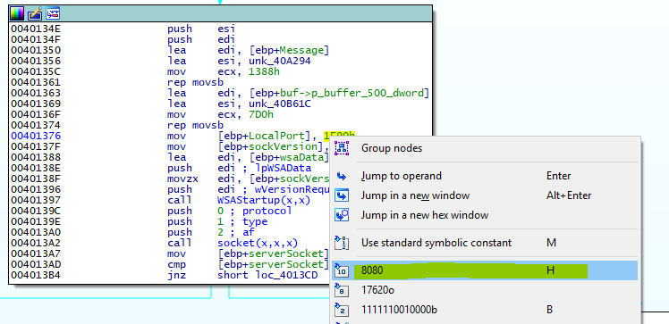 Vemos más abajo en la dirección 0x401376 que se mueve el valor 0x1F90 a la variable LocalPort, seguramente ese es el puerto por donde la aplicación va a correr, si nos situamos sobre dicho valor damos click derecho nos aparecerá la forma en como queremos representar dicho valor, presiono el que muestra en decimal y seria 8080 , ahí esta el puerto por donde correrá nuestro VulnServer.