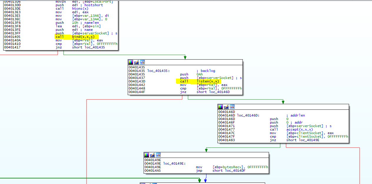 Ya con esto aclaramos todo para verificar que utilizaremos la función socket para nuestro VulnServer, vamos avanzar o si no esto será demasiado largo, si recorremos la linea verde que es lo ideal donde nuestro software se levantaría sin ningún problema, veremos funciones como listen, bind las cuales son funciones que van a levantar nuestro server.