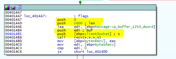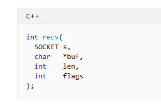 Este buffer es utilizando en la función recv, realmente cuando uno esta analizando software que sean de tipo server web o utilicen conexiones por socket los puntos más importantes para analizar son las funciones recv, ellas son quien reciben los datos de parte del cliente, en este caso veamos la estructura de la función recv desde MSDN.