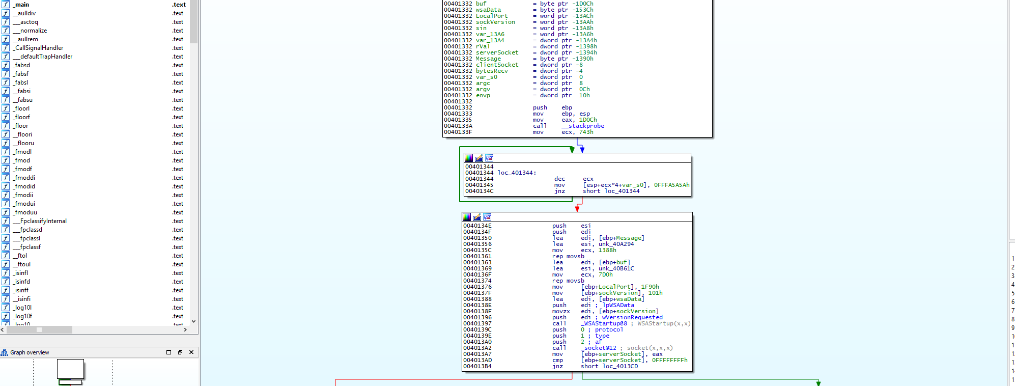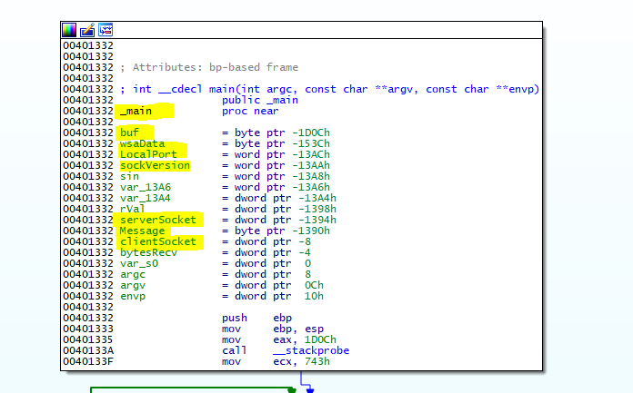 Si nos fijamos en la siguiente imagen, IDA es un muy inteligente ya que nos ha renombrado algunas variables dentro del main del ejecutable como Buf, LocalPort, SockVersion, ServerSocket, Message por lo cual nos da un pequeño indicio de que estamos tratando con un software que utiliza socket para comunicarse.