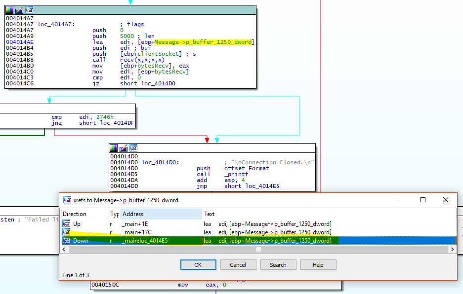 Si buscamos referencias a nuestro Message->p_buffer_1250_dword presionando la tecla x sobre el nombre vemos 3 referencias, vamos a la tercera que nos indica que hay un uso más abajo del que acabamos de analizar.