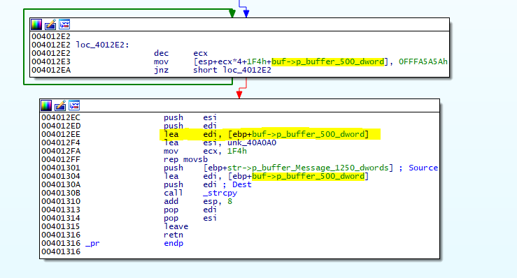 Vemos que el puntero al buffer se paso como argumento y que posiblemente sera utilizado mas adelante, si nos fijamos observamos otro buffer con el nombre buf, que tiene un tamaño de 500 dwords, y vemos algo mas sospechoso todavía, se utiliza la función strcpy para copiar datos del buffer de 1250 dwords al de 500 dwords, creo que acá esta el problema de desbordamiento 🙂