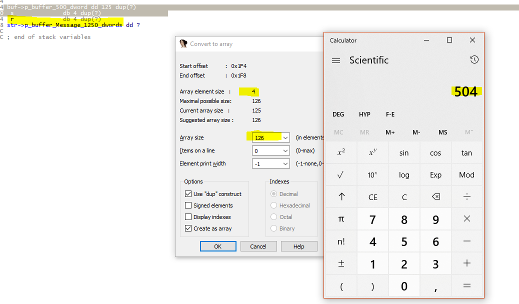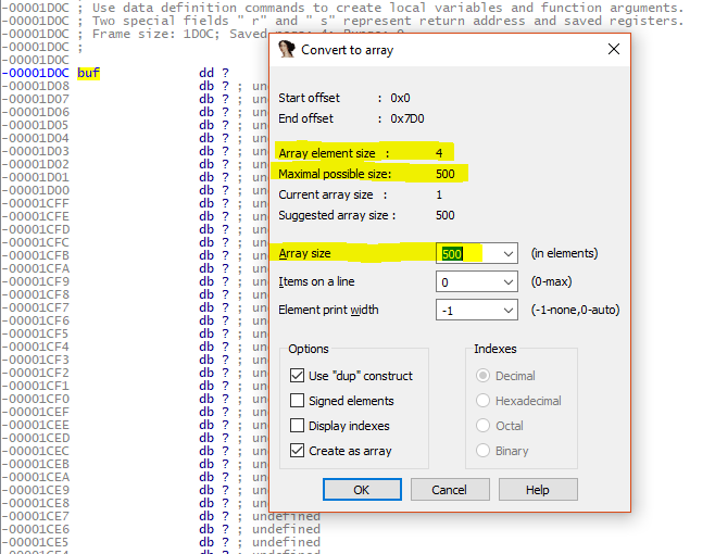 Si presionamos en ok veremos el resultado final, adicionalmente cambiaré el nombre de la variable a buf->p_buffer_500_dword, para cambiar el nombre damos click derecho sobre el buffer y presionamos rename o la tecla N.