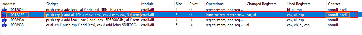 Damos click derecho sobre el modulo crtdll.dll y damos en Search Gadgets y escribimos los gadgets que necesitamos, yo hice mi búsqueda y encontré un push esp ret, así que utilizaremos ese.