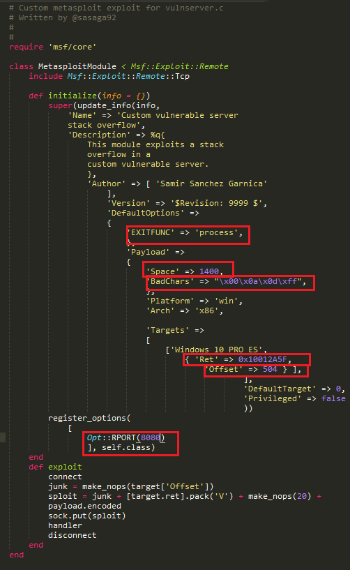 Ya casi hemos llegado al final de nuestra entrada Explotando VulnServer y creo que ya es hora de migrarlo a metasploit, para eso voy a subir la plantilla final del exploit y cuales son los items más importantes de su contenido.