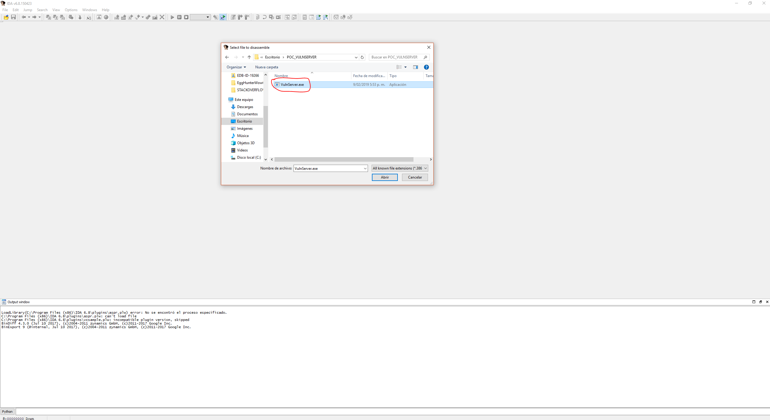Bueno ha llegado la hora de la acción y lo primero que haremos será abrir el archivo ejecutable desde ida pro, ya que para hacer un análisis estático, prefiero utilizar este debugger, ustedes pueden elegir el que deseen, los cuales recomendé en la entrada PREPARANDO EL ENTORNO DE EXPLOITING, este análisis se hará para este caso lo más manual posible sin utilizar scripts automatizados que nos arme todo, sino que lo haremos lo más estático posible para entender que es lo que sucede.