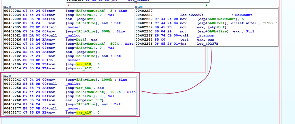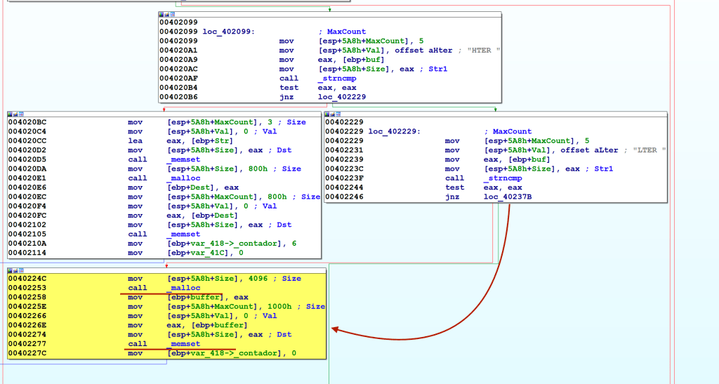 Luego de pasar estas comparaciones vienen unas inicializaciones de buffer dinámicas en memoria con malloc, de 0x1000 y luego llena los bloques de reservados con memset.