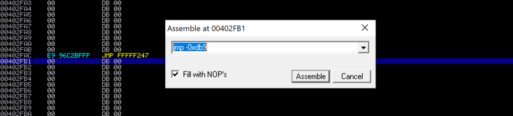 Si no saben como buscar los opcodes de un salto negativo como -0xdb9 pueden usar el assamble de immunity debugger y escribir por ejemplo jmp -0xdb9 y les aparecera algo asi.