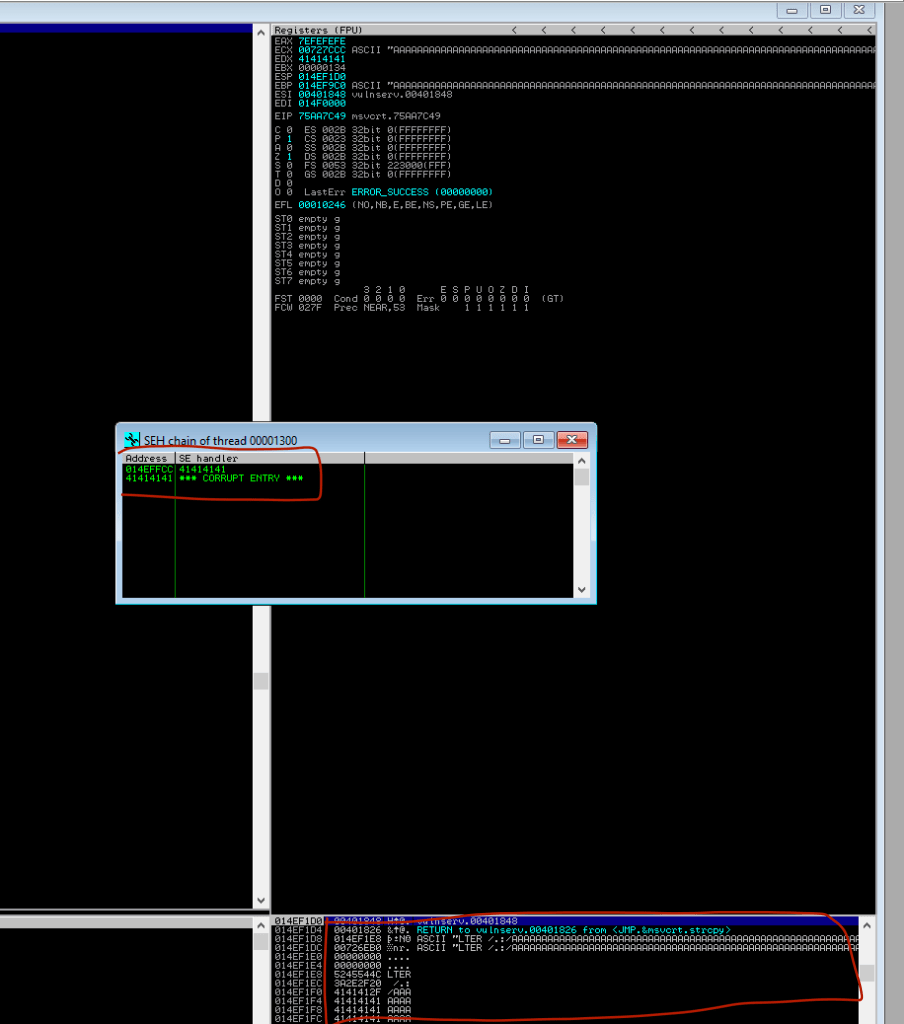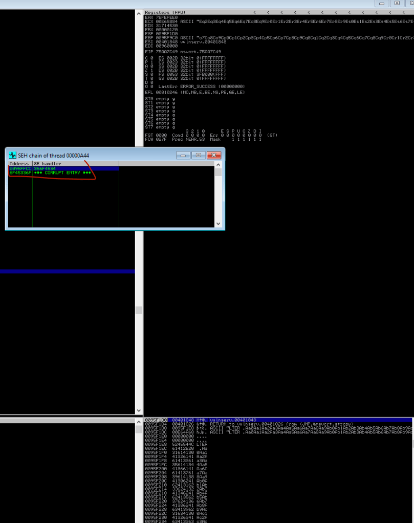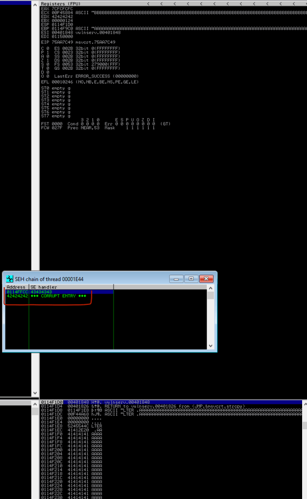 Vemos que nuestro programa se ha hecho trizas, nuesro fuffer ha hecho un buen trabajo y ha roto muchas cosas en VULNSERVER, sobreescribimos el SEH y nos muestra adicional en el stack la función strcpy que es la que al parecer ocasionó el problema, también vemos que el parámetro LTER lleva el punto como habiamos visto en el análisis estático, parece que el fuzzer se lo agrego automáticamnete, genial.