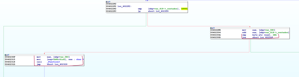 Una vez terminada de hacer todas esas jugadas, encontramos una última comparación donde en la posición de nuestro buffer compara con 0x2e o «.».