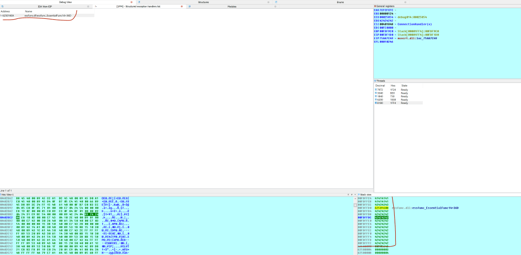 Genial, tenemos un gadget que cumple con los requisitos, reemplazemos nuestro SEH con el valor de nuestro gagdget haber que sucede, ponemos un breakpoint en nuestro gadget, corremos el depurador y lanzamos nuevamente el exploit.