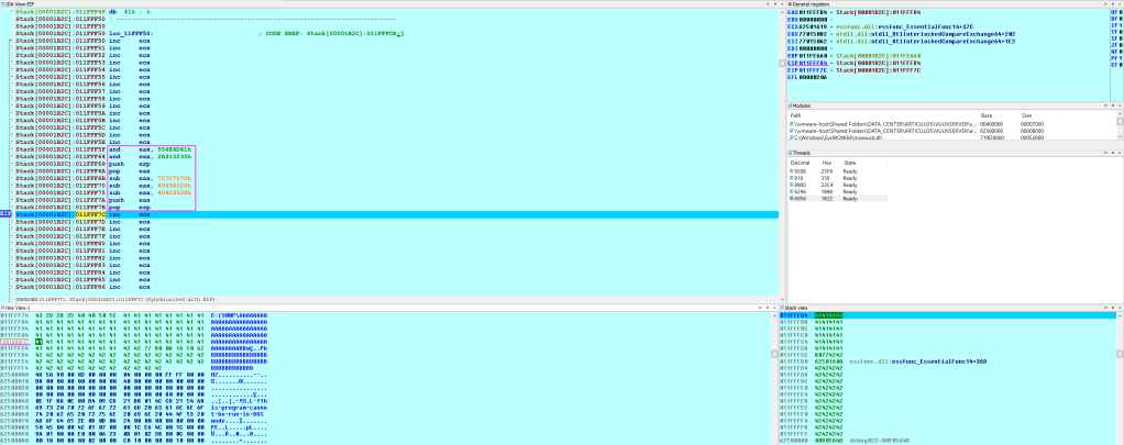 El objetivo aquí es volver al principio del búfer para tener más de 3000 bytes para trabajar. Lo primero que debemos hacer es alinear la pila en nuestra área de búfer actual. Para hacer esto, aumentamos ESP en 0x1a48 para colocar ESP justo al final de nuestro búfer actual. Entonces, todo lo que empujemos a la pila se ejecutará. Para hacer esto, introducimos el valor de ESP en la pila, lo introducimos en EAX, lo ajustamos usando la codificación secundaria y luego introducimos el valor de EAX en la pila y lo introducimos en ESP. Ahora, nuestra pila se encuentra al final de nuestro segmento de búfer actual.