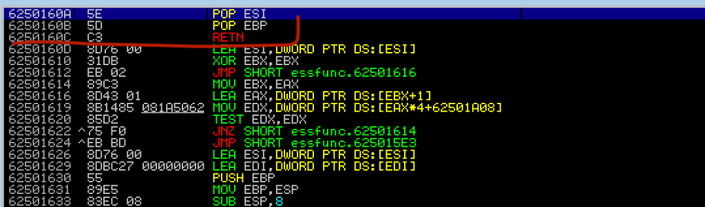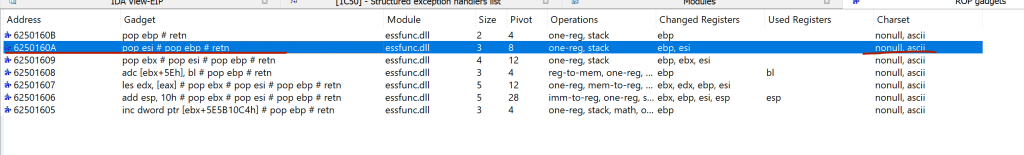 Excelente!!!, ya tenemos el SEH controlado, busquemos nuetsro gadget pop – pop – ret, debemos tener en cuenta que nuestro gadget no debe tener valores mayores a 0x7f, ya que hará la resta sobre ese mismo valor, la opción en estos momentos es trabajar con valores alphanumeric, así que vamos a buscar nuestro gagdget, afortunadamente VULNSERVER mantiene una dll, (essfunc.dll) la cual no tiene ASLR ni protección de SEH, así que podemos usar esa dll para buscar nuestro gadget, yo usaré idasploiter o el mismo immunity debugger para buscar el gadget, con idasploiter pueden ver su uso desde acá.