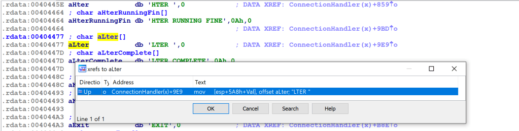 Damos doble click sobre la primera string LTER en .rdata:00404477, buscamos sus referencias presionando X sobre la palabra LTER luego de haber presionado doble click, de la siguiente forma.