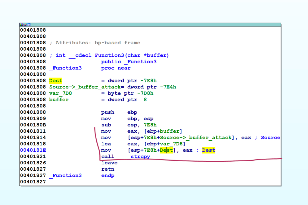 Podemos observar que recibimos como parámetro nuestro buffer que es la data que nosotros enviamos, y se hace una copia sin validar el size a nuestro buffer de destino inicializado al inicio de la función LTER con un size de 0x1000 y rellenado con 0.