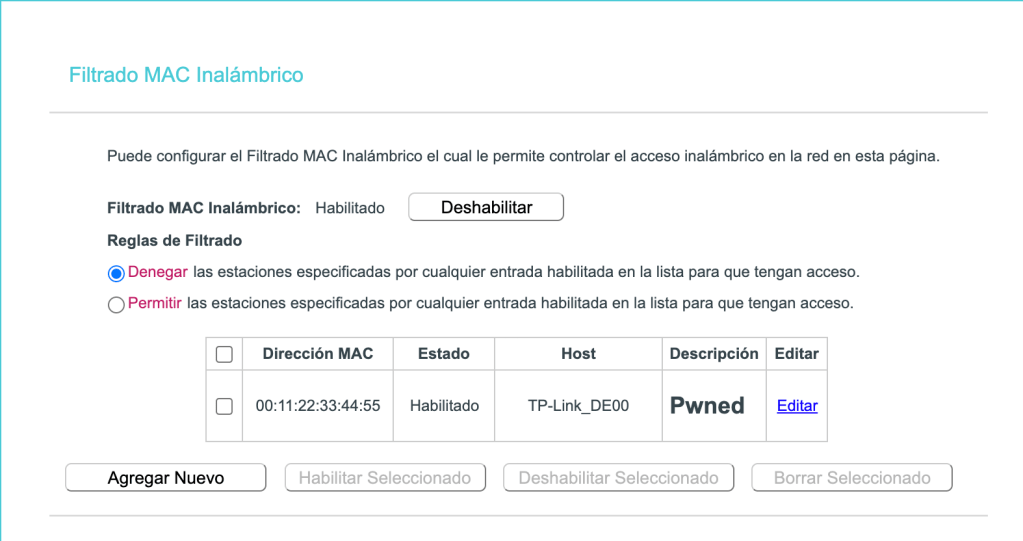 Esta versión es afectada por la ejecución de codigo remoto el modulo inhalambrico->Filtrado de Mac.